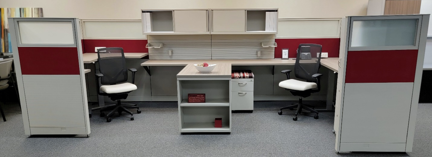 Davies’s remanufactured lines are highly customizable, combining all of the performance benefits you want from a cubicle system with your company’s personal design and aesthetics. Westart with previously enjoyed workspace cubicles that are brought into our remanufacturing facility and upgrade the system with your choice of fabrics and finishes, storage solutions, accessories, and more. But the customizability doesn’t stop with individual pieces. We let clients blend solutions, mixing and matching manufacturers, supplementing new furniture with recycled pieces, and have a team of professional designers to help you achieve any vision on any budget. This blending of solutions is our specialty at Davies, and we’re passionate about the possibilities. Businesses can make their offices shine in 2022 and beyond with our custom design solutions — leading to stunning impressions, higher employee retention, and more!